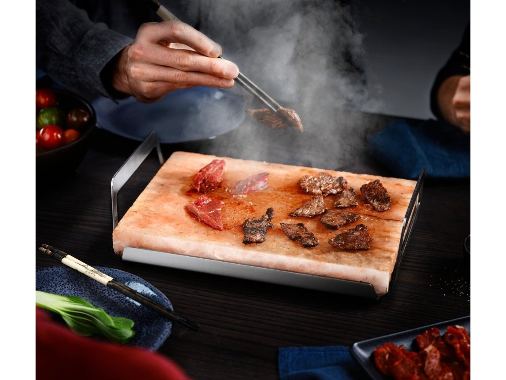 Ihned po ohřevu solné desky na ní můžete jídlo i podávat. Teplota na povrchu solné desky zůstává stejná a každý pokrm díky tomu získá optimální chuť.