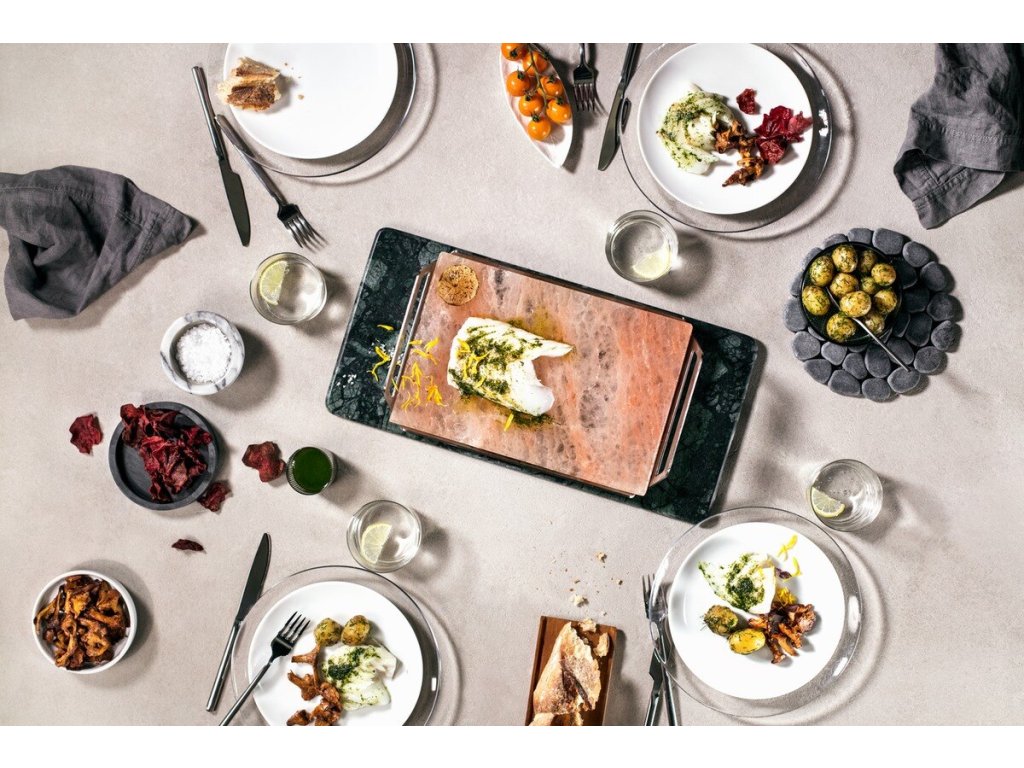 Chcete-li na své hosty zapůsobit, připravujte večeři na solné desce přímo na jídelním stole. Přírodní minerály udrží v desce vysokou teplotu i dlouho poté, co opustí troubu.