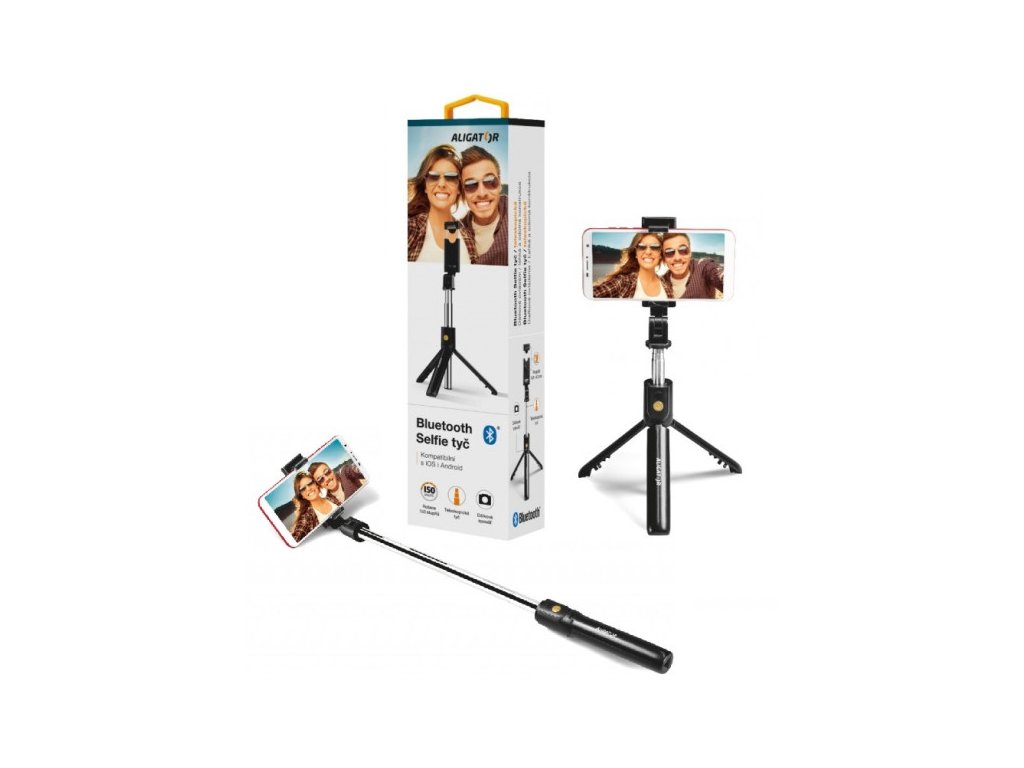 ALIGATOR držák selfie s BT HA12 černýTeleskopická selfie tyč s Bluetooth vyjímatelným ovladačem a tripodem