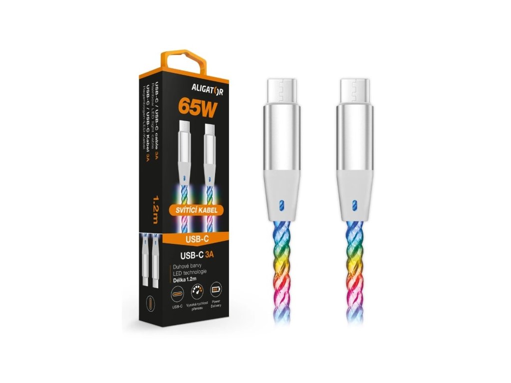 ALIGATOR kabel USB-C/C datový 1,2m 3A 65W svítící DATKP62Duhově svítící LED kabel řady ALIGATOR POWER s kovovými konektory USB-C/USB-C nejvyšší kvality, o výkonu 65W a možností nabíjení až 3A.