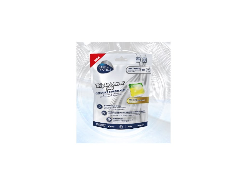 Kapslový odstraňovač vodního kamene a odmašťovač CARE + PROTECT Triple Power pro pračky/myčky, dezinfekční prostředek pro celý cyklus, čisticí prostředek, odstraňovač vodního kamene, účinné tekuté složení, rychlé působení, beze zbytků, energeticky úsporné řešení, jedno balení se šesti kapslemi, šestiměsíční ochrana