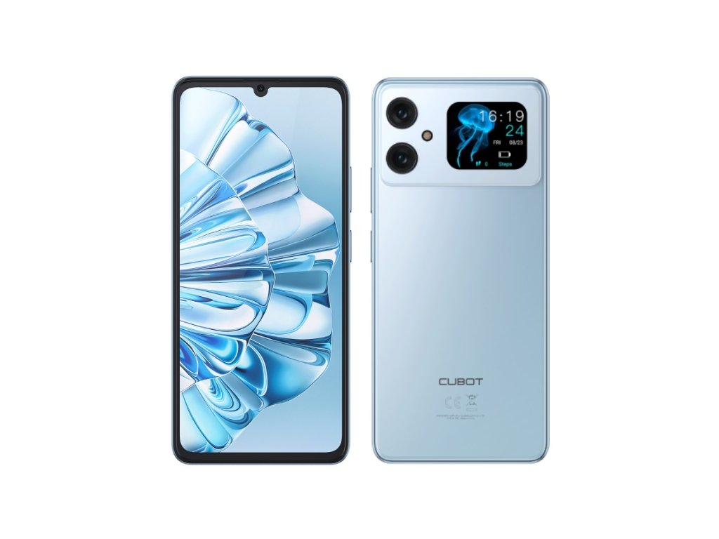 Cubot A20 zaujme na první pohled. Elegantní tělo skládající se ze skla a plastu je dostupné ve dvou barvách — klasická černá a modrá — takže si každý najde to své. Kromě velkého 6,75” IPS HD+ displeje s 90 Hz obnovovací frekvencí má telefon také menší 1,83” dotykový displej na zadní straně, který ukazuje upozornění, umožňuje ovládat hudbu nebo rychle zkontrolovat čas a stav baterie.