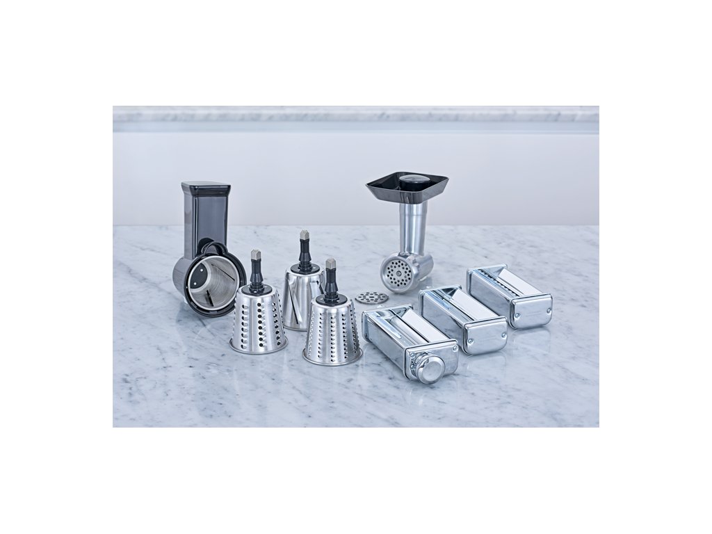 Tři nástavce na hnětání, míchání a šlehání, nástavec na mletí masa, 3 nástavce na strouhání a krájení, Modře podsvícený regulátor rychlosti - nastavení v 10 stupních, bílá led dioda osvětlující prostor v míse pro lepší přehled při práci.