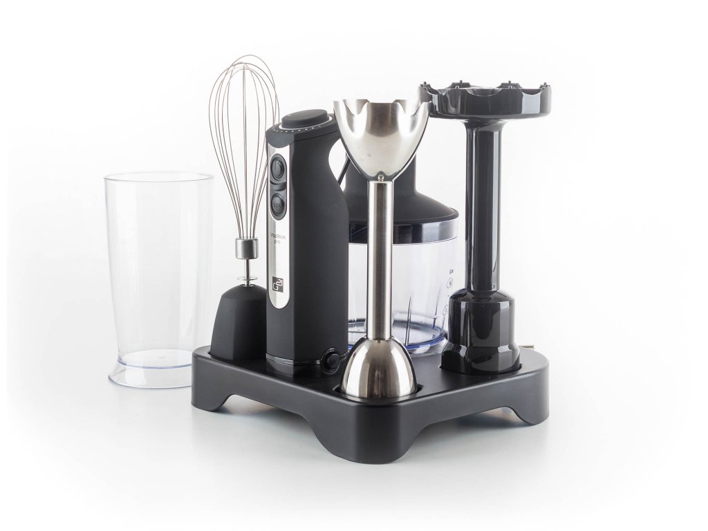 G21 mixér VitalStick Pro 1000W černýMultifunkční tyčový mixér G21 VitalStick Pro v černé barvě s výkonem 1000 W. Rozložení nožů 3D Quattro blade systém pro mixování ve 4 úrovních. Mixovací nástavec, šlehací metla, nástavec na pyré, nádoba na sekání, nádoba na šlehání, stojan.