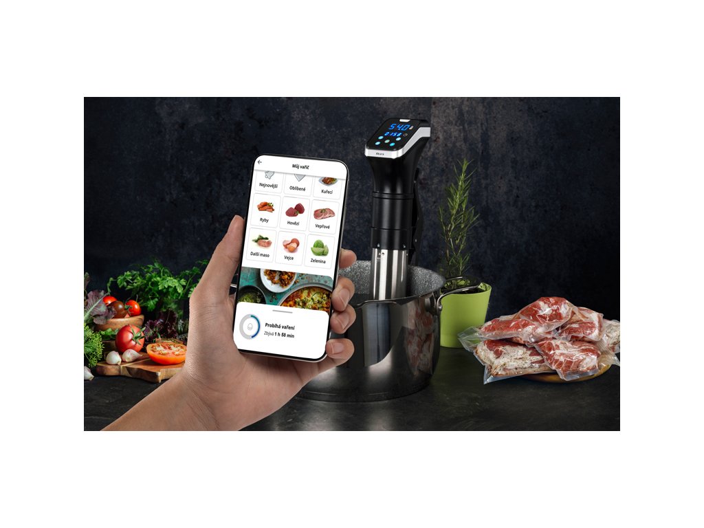 Příklad: Vložíte do hrnce s vodou zavakuované suroviny a odejdete do práce nebo na výlet. Cestou si na mobilu zvolíte recept a pošlete přes apku pokyn do sous-vide G21 Akura. Po návratu můžete prostírat.