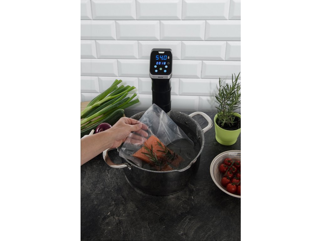 Ponorný pomalý vařič G21 Akura pro vaření ve vakuu je připraven pro každodenní bezpečné použití a vyladěný do nejmenších detailů. Masivní tělo se skládá ze dvou částí – ponorná nerezová část s vnitřní varnou spirálou a vrchní část z odolného plastu s elektronikou a dotykovým displejem. K hrnci se sous-vide G21 Akura připevní svorkou/klipsem.