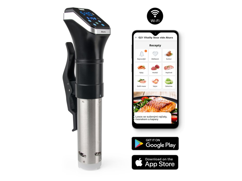 G21 Sous vide Akura WiFi 1000WPro zdravé vaření s plnou a dokonalou chutí i vůní potravin použijte pomalý vařič Sous vide G21 Akura s WiFi ovládáním přes mobilní aplikaci s recepty.