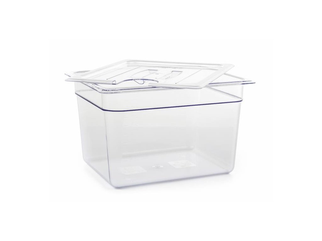 Nádoba G21 pro sous-vide vaření je vyrobena z vysoce odolného polykarbonátu a oproti kovovým hrncům efektivněji udržuje teplotu a zahřátí vodní lázně trvá kratší dobu. Polykarbonát splňuje nejpřísnější požadavky na bezpečnost a je zdravotně nezávadný. Díky vysoké stálosti použitého materiálu je možné nádobu mýt v myčce na nádobí, což vám ušetří mnoho času i námahy s úklidem. Dále je nádoba vybavená sundavací poklicí s výřezem na sous-vide vařič. Poklici však lze používat i s vařičem jiné značky, neboť se do otvoru vejde většina vařičů na trhu.