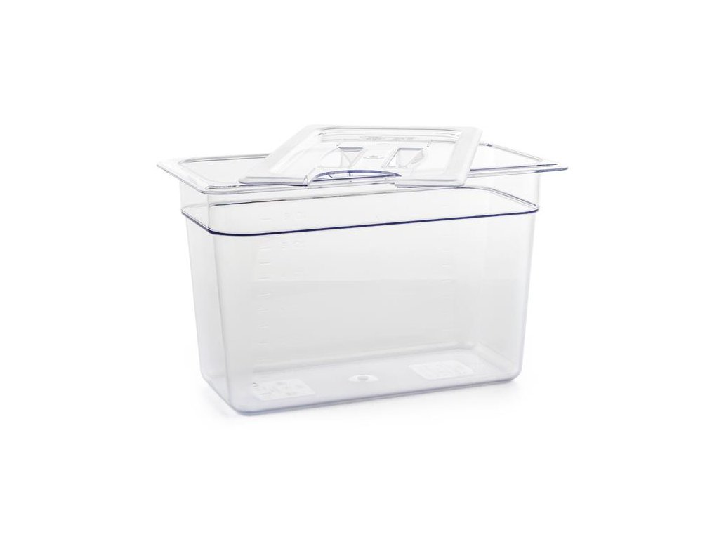 Nádoba G21 pro sous-vide vaření je vyrobena z vysoce odolného polykarbonátu a oproti kovovým hrncům efektivněji udržuje teplotu a zahřátí vodní lázně trvá kratší dobu. Polykarbonát splňuje nejpřísnější požadavky na bezpečnost a je zdravotně nezávadný. Díky vysoké stálosti použitého materiálu je možné nádobu mýt v myčce na nádobí, což vám ušetří mnoho času i námahy s úklidem. Dále je nádoba vybavená sundavací poklicí s výřezem na sous-vide vařič. Poklici však lze používat i s vařičem jiné značky, neboť se do otvoru vejde většina vařičů na trhu.