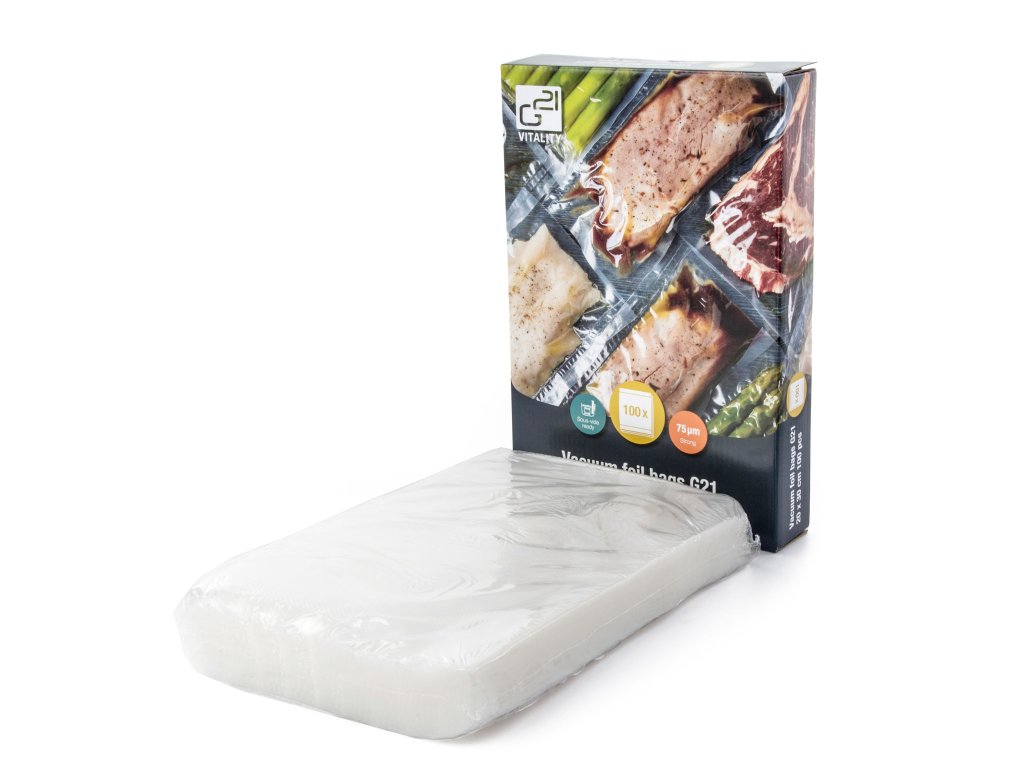 Vakuovací sáčky G21 o rozměrech 20 x 30 cm jsou díky své vysoké pevnosti a kvalitnímu provedení vhodné nejen pro prodloužení trvanlivosti potravin vakuováním a jejich uchovávání v ledničce nebo v mrazáku, ale využijete je i k vakuování surovin pro sous-vide vaření.