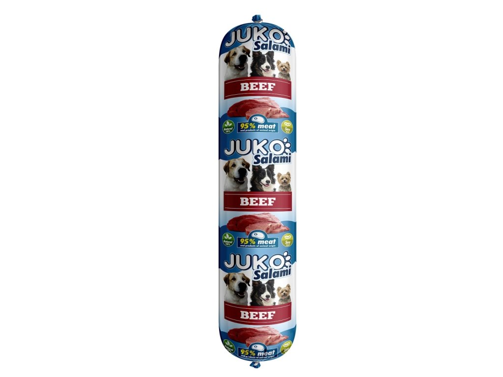 JUKO Salami Beef je ideální pro psy všech věkových kategorií. Vhodné jako kompletní krmivo či jako doplněk ke granulím.