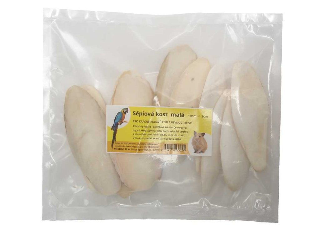 Kost sépiová 10cm malá 20ks (+-3cm).Účinná pomůcka při obrušování zobáku a cenný zdroj vápníku pro ptáky.
