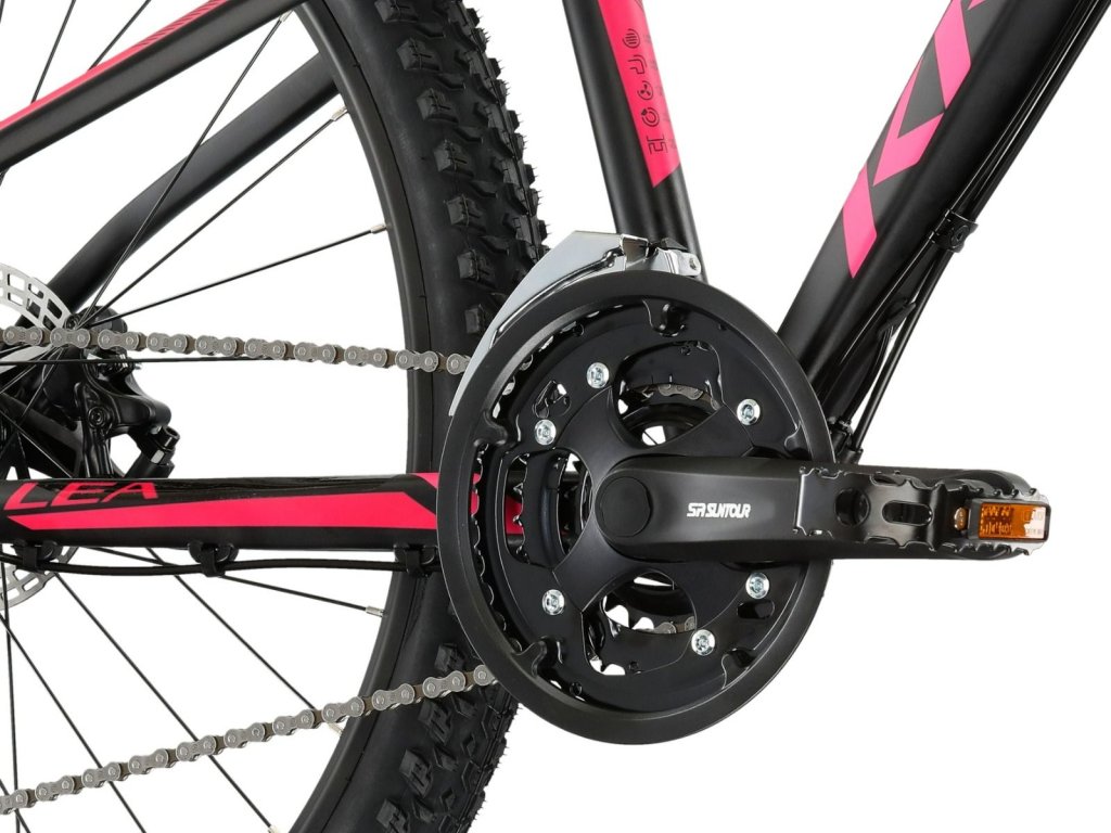 KROSS Lea 6.0 SR má kvalitní příslušenství od renomovaných výrobců. O příjemnou a rychlou změnu převodů se starají přední a zadní přehazovačky Sunrace. Díky třířadému ozubenému kolu a sedmistupňové kazetě jsme byli schopni vybavit kolo 24rychlostními převody, což se vám bude hodit v každém terénu, do kterého se s kolem vydáte. KROSS Lea 6.0 je vybaveno odpruženými vidlicemi SR Suntour XCT30 HLO, které usnadňují jízdu po nerovném lehkém terénu, se kterým se můžete na cestě setkat. Kolo je také k dispozici s 27,5 nebo 29 palcovými koly. Je jen na vás, na jaké velikosti kol chcete jezdit. Bez ohledu na to, jakou velikost si vyberete, najdete na ni pláště Mitas Ocelot V85 o šířce 2,1 palce, které najdou uplatnění v jakémkoliv terénu. Kromě toho je kolo vybaveno mechanickými kotoučovými brzdami JAK-Y1. Pohodlný provoz a vysoká brzdná síla jsou dvě nejdůležitější vlastnosti tohoto modelu.