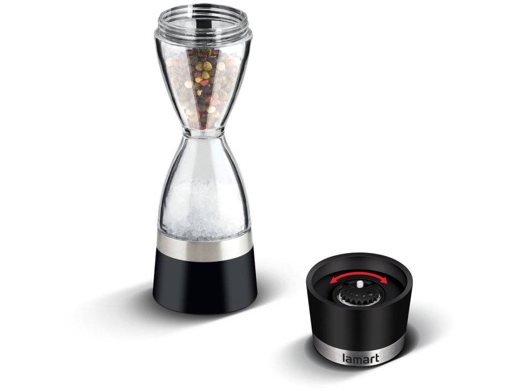 LAMART LT7045 mlýnek 2x60ml SANDGLASSMlýnek na koření/pepř/sůl je vyroben z plastu s keramickým mlecím mechanismem s nastavitelnou hrubostí mletí