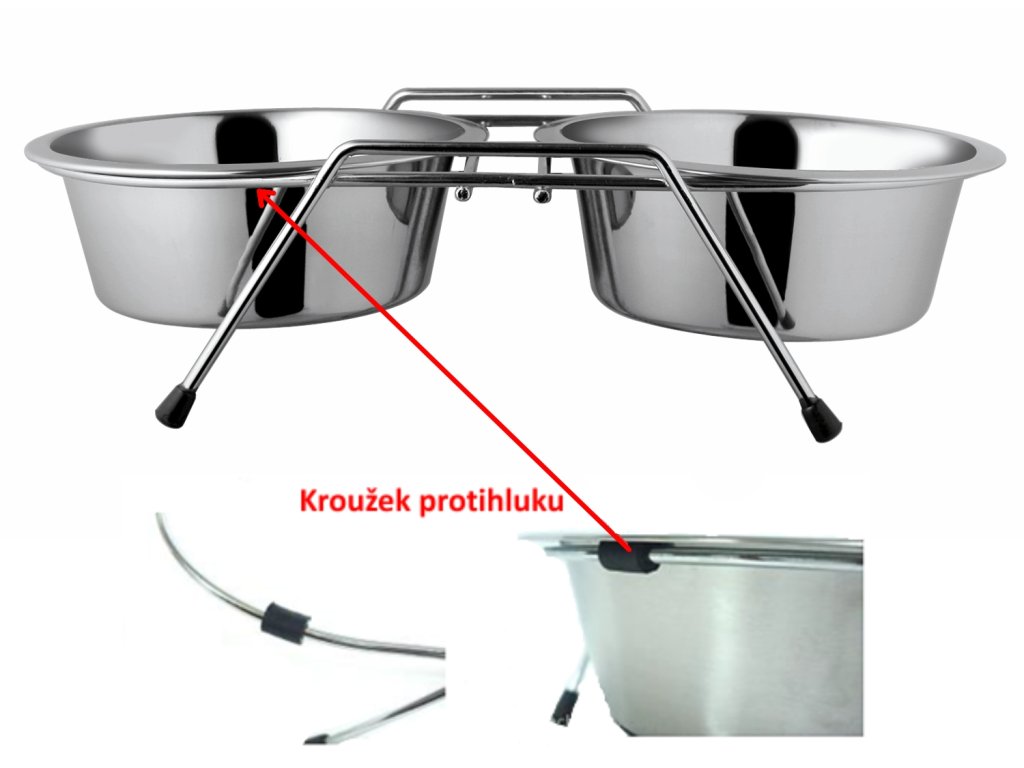 Obsahuje 2x misku pro psy a 1x stojan s kroužky proti hluku.