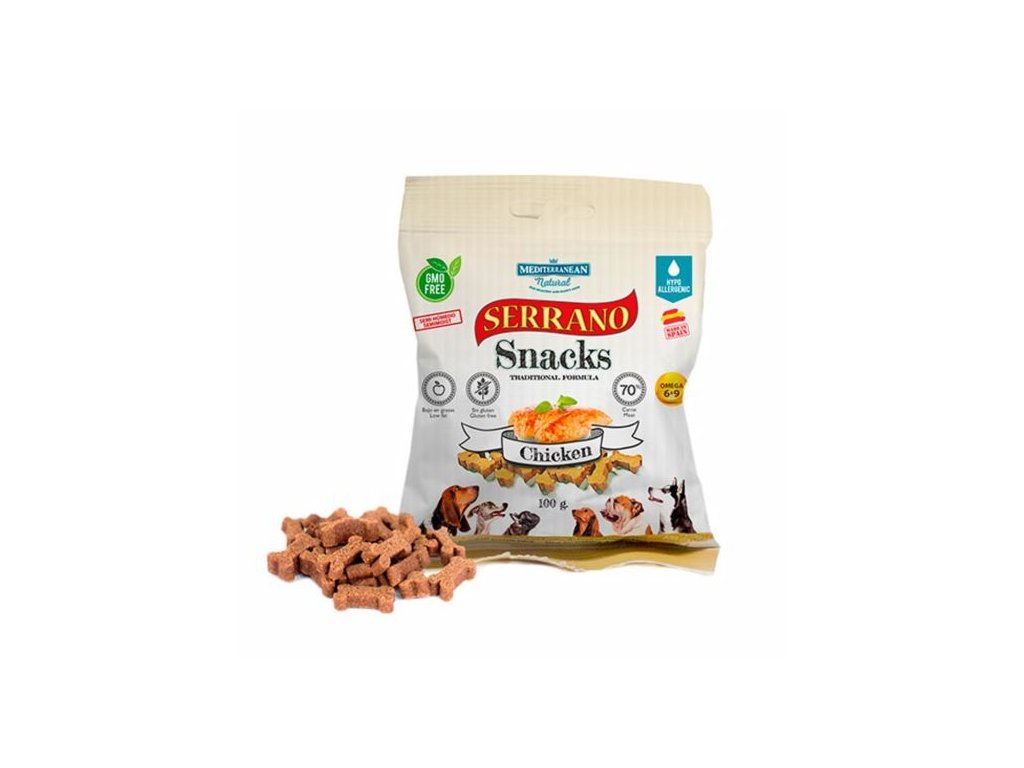 Serrano pamlsek pro psy kuře 100gLahodný pamlsek pro psy ve tvaru malých kostiček s kuřecím masem a rýží. Obsahuje 70 % čerstého masa.