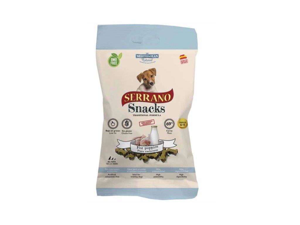 Pamlsek pro štěňata Serrano s mlékem 100gLahodný pamlsek pro štěňata ve tvaru malých kostiček se serrano šunkou, kuřecím masem a rýží.