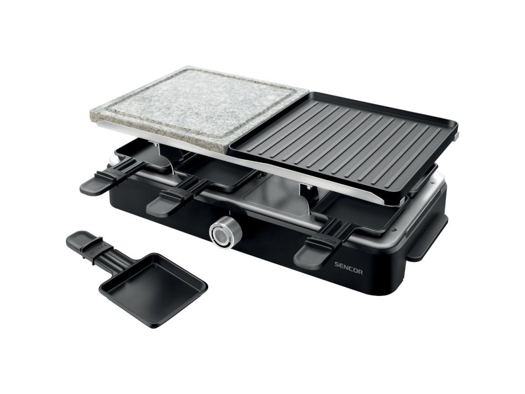 SENCOR SBG 0260BK: Raclette gril 2v1, kombinovaná deska, 8 pánviček, 1400 WKombinace 2 v 1, rovná a žebrovaná grilovací plocha