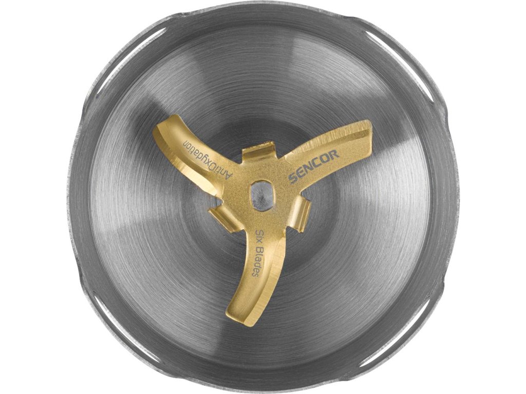 Disponuje 6 nerezovými noži s funkcí drcení ledu, plynulou regulací rychlosti a turbo režimem.
