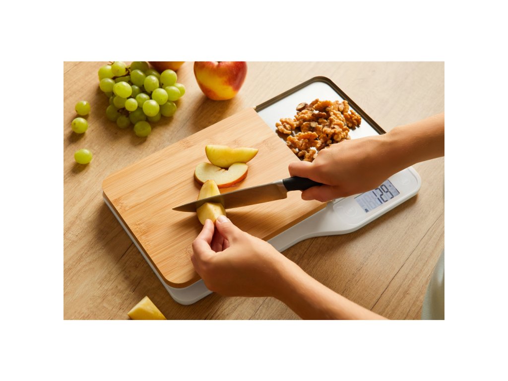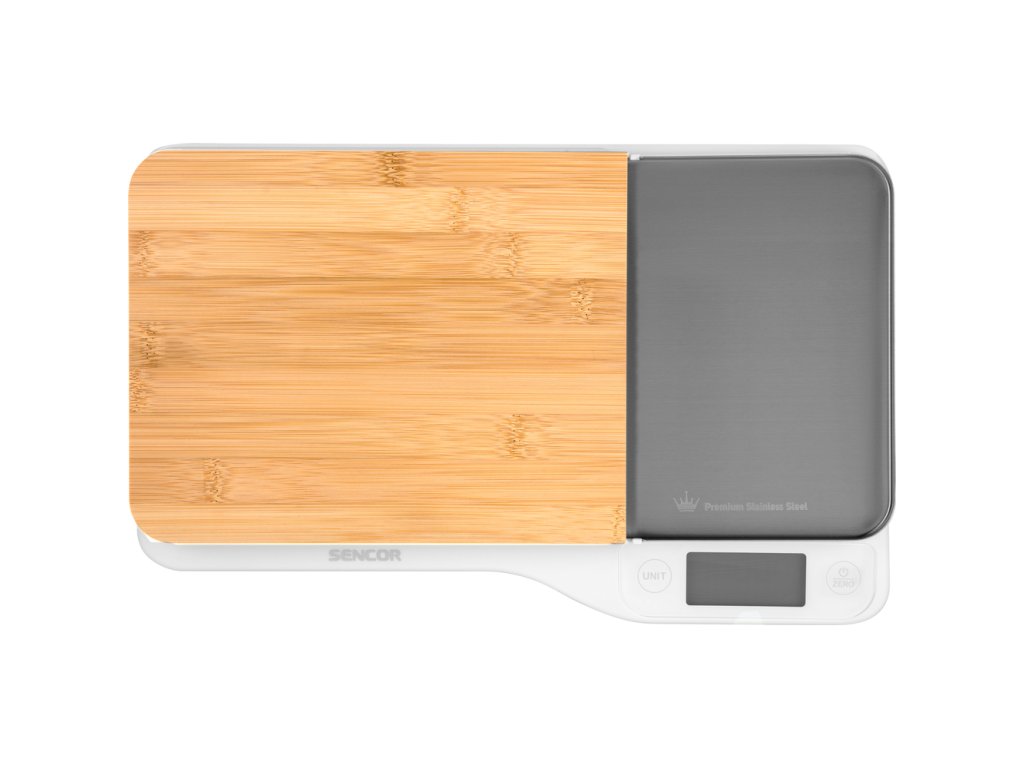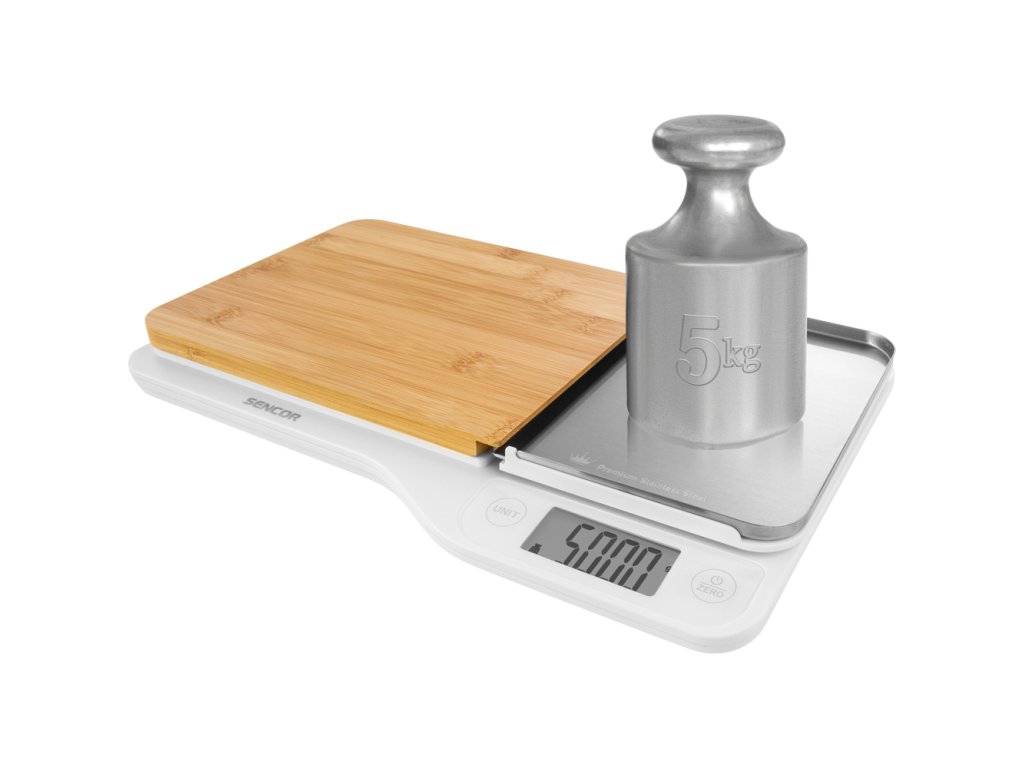 SENCOR SKS 6501WH kuchyňská váha 5kg.Elektronická kuchyňská váha s bambusovým prkénkem a vyjímatelnou nerezovou miskou