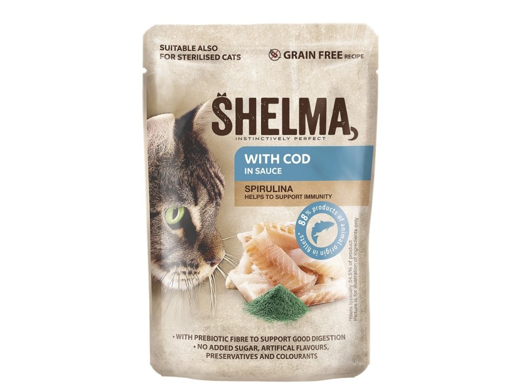 SHELMA kapsa pro kočky 85g s treskou a spirulinou v omáčceSuperprémiové kompletní krmivo pro kočky s treskou a spirulinou.
