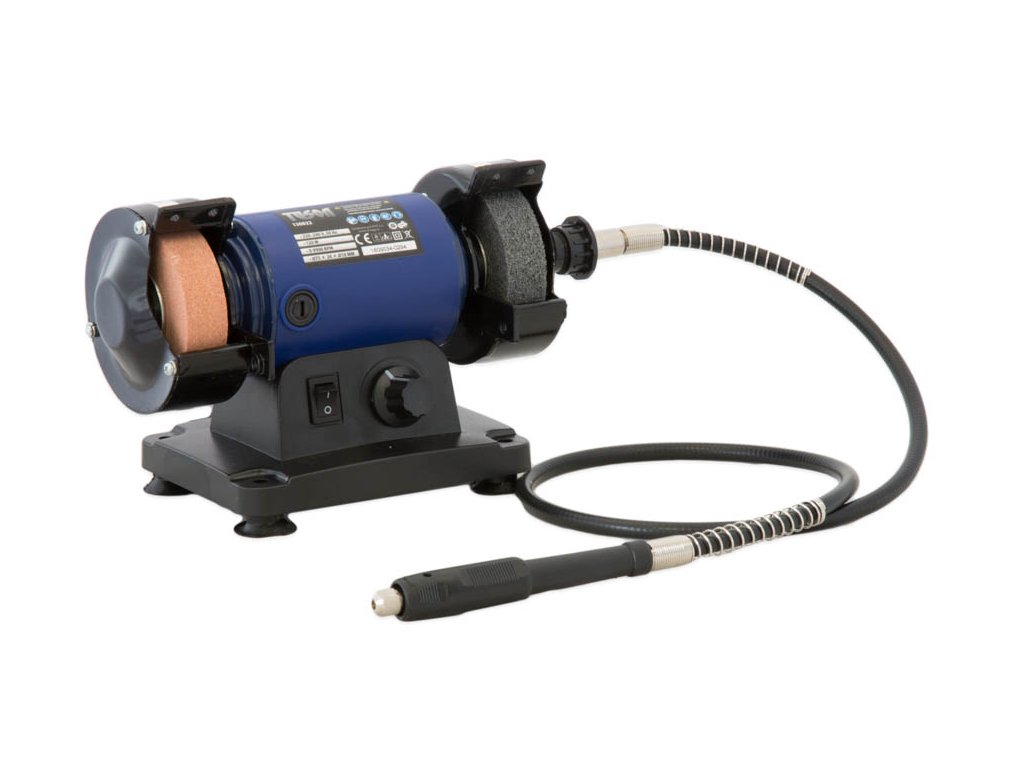 TUSON bruska mini dvoukotočouvá s přídavnou přímou bruskou.TUSON - Dvoukotoučová bruska je kombinovaný přístroj k broušení a leštšní kovů, plastů a dalších materiálů za použití odpovídajících brusných a leštících kotoučů.