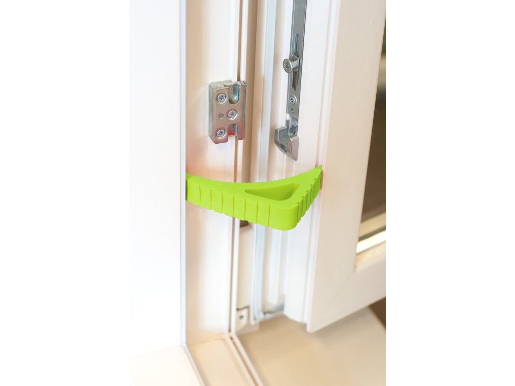 Jeho trojúhelníkový tvar, jeho vnitřní otvor, jeho 3 promáčknuté strany a jeho materiál umožňují jeho umístění do dveří i oken, podle každé potřeby: